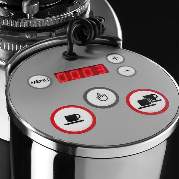 The electronic panel can be programmed for two separate doses, each timed for 1-99 seconds, ideal for both single and double shots. Also has a manual grind out when you just need that extra little bit.