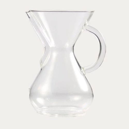 Chemex 6 Cup featuring the Glass Handle combines simple function with visual elegance. The same beautiful hourglass carafe that makes Chemex unique is paired with a graceful but sturdy handle.