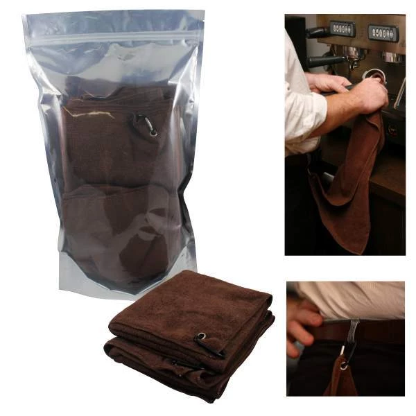 The Clean Machine Barista Cloth set offers a commercial quality hard wearing set of 10 microfibre cloths. The brown coffee cloth has a generous length and handy clip for quick and easy use. Dimensions are 30cm x 59cm – Bronw (wit clip) – or 40cm x 40cm Black (no clip)
