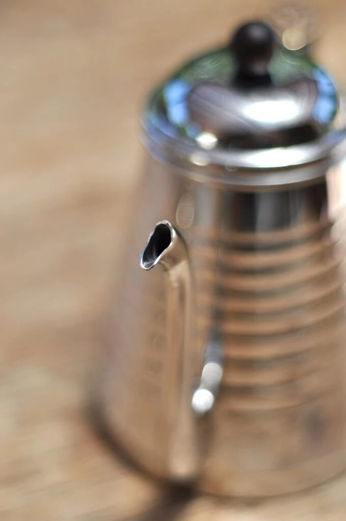 The kettle is primarily built from grade 18-8 stainless steel. It’s thicker than most kettles, but also maintains a steady temperature for longer. The carved wooden handle is easy to handle when the steel is hot, and a brass thumb-rest above the handle makes for comfortable pouring.