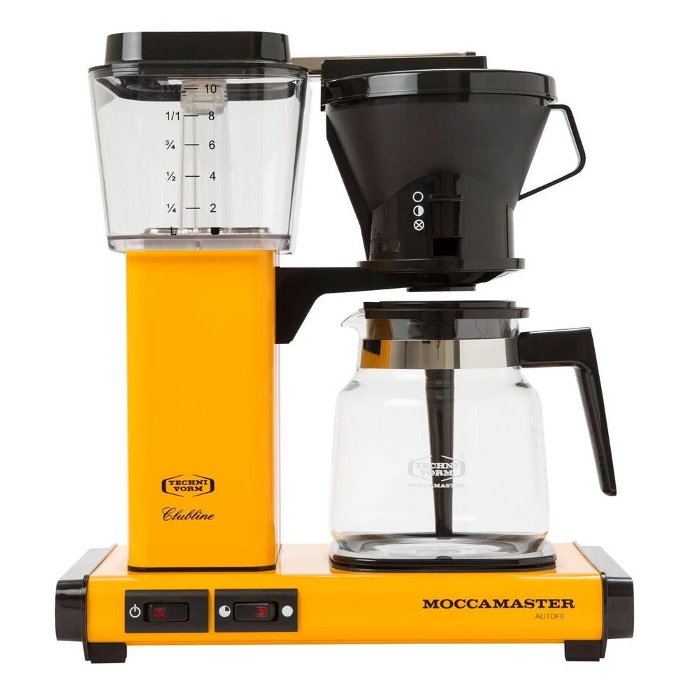 The Moccamaster Classic includes a glass carafe on a hot plate, with a capacity of 1.25 litres. Available in polished silver, matt black, white, red, orange, royal blue, fresh green, grape, yellow pepper, turquoise and pink.