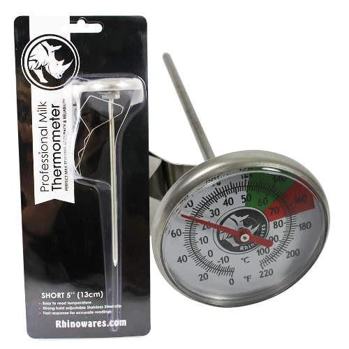 The easy to read dial on the Rhino Coffee Gear Milk Thermometer allows for quick and accurate measure of textured milk and other beverages. The specially designed stainless steel clip allows the thermometer to sit perfectly in any milk pitcher. Designed with positive lock, quick-release action, the thermometer stem can be adjusted to the desired height. When the clip is removed, the thermometer can also be used for general purpose cooking needs. Short Thermometer is 5″ (13cm).